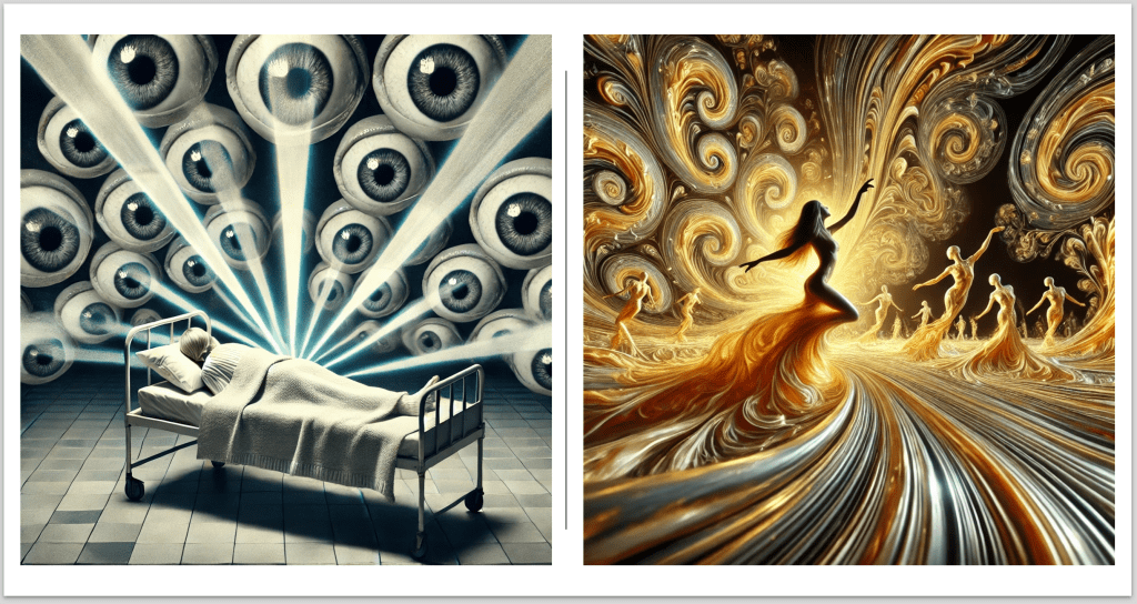 Attention and eye movements: Pain has a way of narrowing your world down to a pinpoint, the more intense it gets, the more laserfocused your attentional spotlight feels. It felt like there was no space left for me to direct my attention voluntarily anymore, “top-down”, it was constantly hijacked by every visceral sensation, my mind fixated on each jolt, every sharp edge of discomfort. Even my eyes seemed to rebel against me—they locked onto the room, scanning everything in a hyper-focus, desperate for an escape that wasn’t there. I could feel them darting from the IV in both of my arms to the harsh lights overhead, back and forth, searching for something, anything to alleviate what was happening to me. It felt like my whole body was screaming at me to pay attention to it, the body was all that existed, the external world shrunk to the absolute bare minimum.